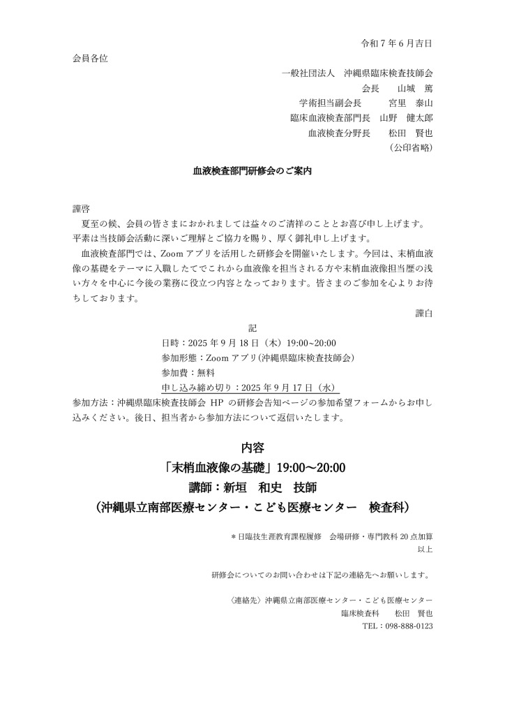 2025年9月 血液検査部門研修会お申し込みフォーム